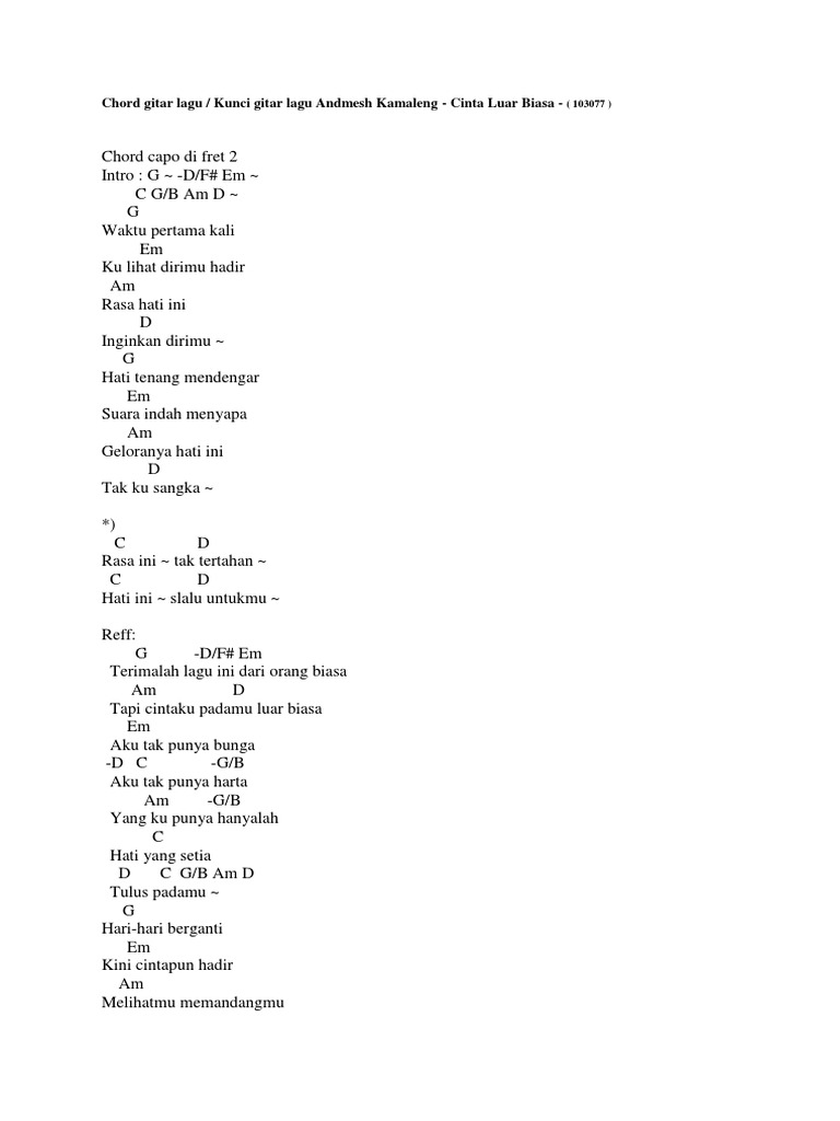Chord Gitar Dan Lirik Cinta Luar Biasa Andmesh Kamaleng Terimalah Lagu Ini Dari Orang Biasa Tribunnews Com Mobile from cdn-2.tstatic.net Bm e yang luar biasa huuu. F#m e suara indah menyapa. — aktifkan lagu cinta luar biasa dari andmesh kamaleng sebagai nada sambung pribadi di nomor kalian, dengan cara : Waktu pertama kalikulihat dirimu hadirrasa hati ini inginkan dirimuhati tenang mendengar suara indah menyapa geloranya hati ini tak ku sangkarasa initaktertahanhati ini selalu untukmuterimalah lagu ini dari orang biasatapi cintaku padamu luar biasa aku tak punya bungaaku tak punya hartayang. Andmesh · album · 2019 · 9 songs. Bazli unic muzik intrument : Lagu cinta luar biasa ini sangat populer dan viral di media sosial dan sudah sering dijadikan sebagai lagu cover oleh banyak youtuber. Lagi masuk angin, 10 potret kocak motif kerokan ini gak seperti biasa.