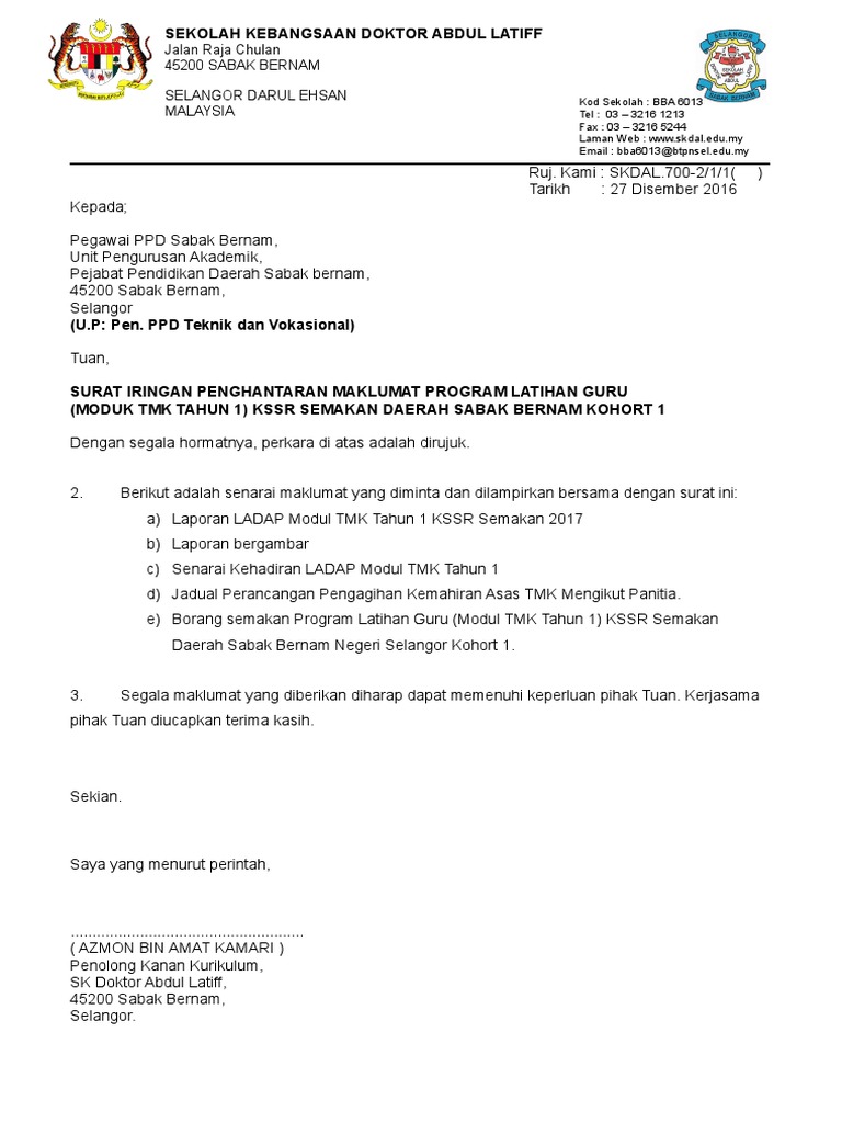 Contoh surat rayuan, surat rayuan sekolah kemahiran, surat surat iringan (6). Ketahui di sini contoh surat iringan permohonan kerja dan cara menulis surat iringan mohon kerja yang lengkap dengan segera! Dengan memberikan surat ini, sekolah menunjukkan dukungannya terhadap prestasi dan pencapaian yang diinginkan siswa. Organisasi siswa intra sekolah (osis). Surat ini ditujukan dalam rangka ajakan untuk membersihkan lingkungan serta lapangan sekolah. Surat iringan mesti dibuat dan dikepilkan sekali semasa menghantar borang atau maklumat kepada pihak atasan. Sebagai organisasi pendidikan yang bersifat non formal, tentu saja di dalamnya seringkali ada kegiatan yang. Contoh surat resmi sekolah harus ditulis dengan menggunakan bahasa yang sopan dan juga penulisan yang sesuai dengan ejaan yang disempurnakan. Contoh surat rasmi tagged with: Untuk makluman anda, ada lagi banyak surat iringan seperti contoh surat iringan sekolah surat iringan mohon kerja yang lengkap mempunyai 3 bahagian utama iaitu Sekolah adalah hal yang sangat penting untuk setiap orang. Berisi contoh surat resmi sekolah, perusahaan, permohonan, surat resmi undangan. Contoh surat pemberitahuan untuk berbagai macam acara.