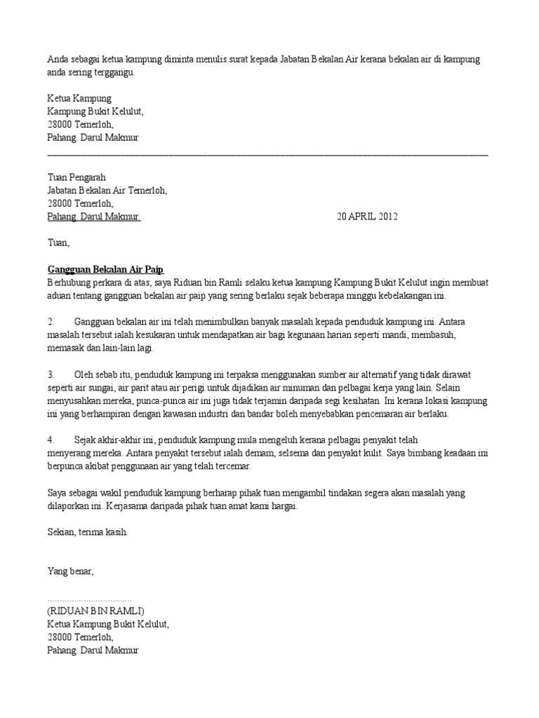 Tuan, gangguan bekalan air paip berhubung perkara di atas, saya riduan bin ramli selaku ketua kampung kampung bukit kelulut ingin membuat aduan tentang gangguan bekalan air paip yang sering berlaku sejak beberapa minggu kebelakangan ini. Gangguan bekalan air tidak berjadual dijangka akan berlaku di tujuh wilayah iaitu di kuala lumpur, petaling, klang/shah alam, kuala selangor, hulu selangor, gombak dan kuala langat bermula pagi tadi. Gangguan bekalan air selangor dan kuala lumpur 2020 ialah krisis bekalan air yang berlaku pada 3 september 2020, yang diakibatkan oleh pencemaran bau daripada kilang haram yang menyebabkan lebih daripada 1 juta penduduk di selangor dan kuala lumpur terjejas. Tak yah cerita lah, lagi mustahil! Berdasarkan lampiran yang disediakan air selangor, kawasan bakal terjejas di wilayah kuala.