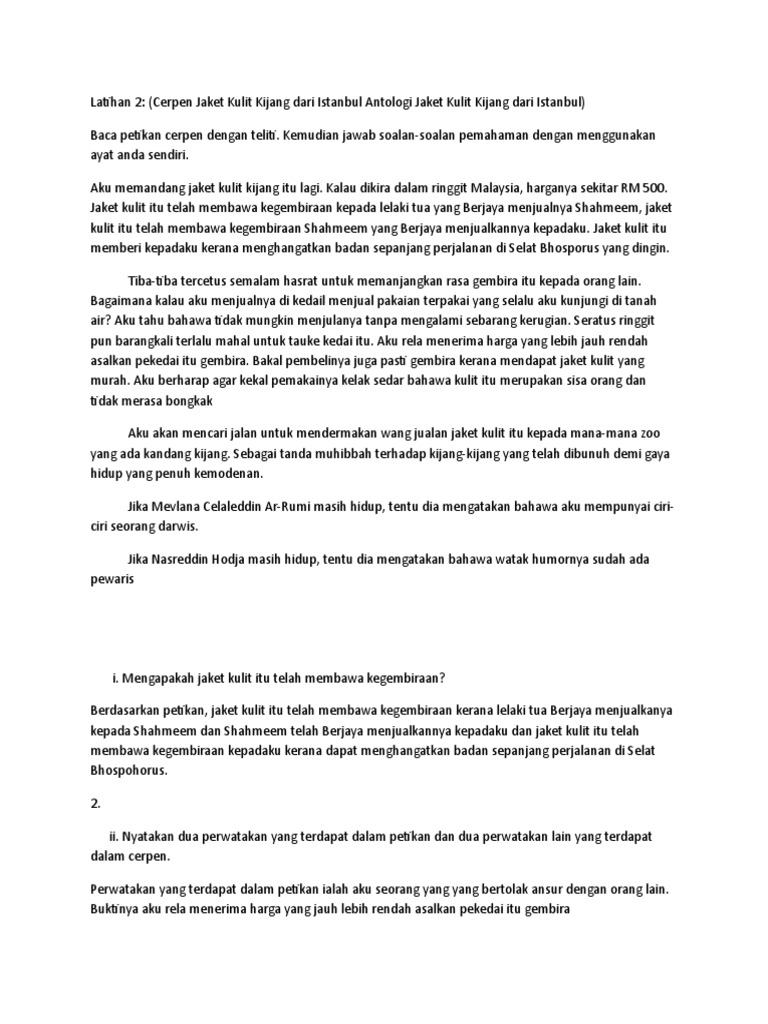 Soalan Komsas Tingkatan 4 Jaket Kulit Kijang Dari Istanbul Persoalan P from image.slidesharecdn.com Pelanduk mitos hindu pokok melaka 1. Scanned by camscanner sesungguhnya, jaket kulit kijang dari istanbul langsung tidak termasuk dalam senarai. Dalam antologi jaket kulit kijang dari bhd. Aku disapa oleh seorang lelaki berbaju t merah, berjaket kulit hitam dan berwajah tampan dari sebuah kedai jaket kulit. Cerpen jaket kulit kijang dari istanbul oleh maskiah haji masrom. Jika dirujuk daripada analisis soalan yang telah. 085729462419, jaket distro bandung grosir, jaket distro bandung online murah. Mengapakah jaket kulit kijang itu telah membawa kegembiraan?